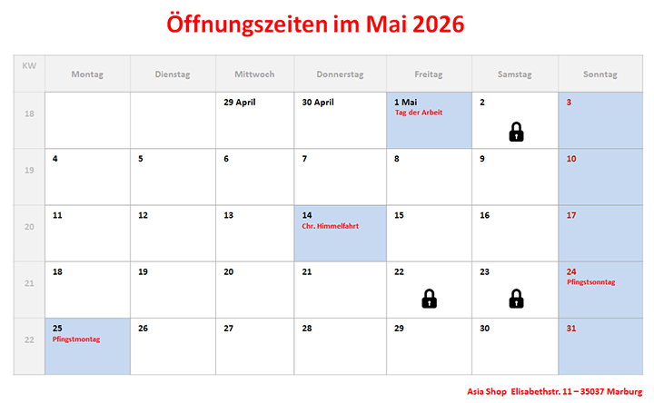 Zum Anlass des Frühlings und chinesischen Neujahrs veranstaltet der Verein der Chinesischen Wissenschaftler und Studenten in Marburg (VCWSMR e.V.) ein Frühlingsfest am 03. Februar 2018 (Details finden Sie hier). Dabei geben wir (Asia Shop - Marburg) 10 Gutscheine im Wert von 100,- Euro zur Verlosung durch den Verein (VCWSMR e.V.). Kommen Sie am 03. Februar 2018 zu diesem Frühlingsfest und nehmen Sie dort am Gewinnspiel und den Veranstaltungen teil. Höchstwahrscheinlich werden Sie Glück haben und gewinnen Sie einen von unseren Gutscheinen. Wir wünschen Ihnen viel Glück! -------------------- Teilnahmebedingungen: - Jede Person kann an dieser Veranstaltung teilnehmen. - Jede Person kann nur einen Gutschein gewinnen. - Die Verlosung findet unter Aufsicht von VCWSMR e.V. statt. - Der Gutschein kann nur eingelöst werden, durch eine vorherige Aktivierung. - Diese erfolgt durch die Anmeldung mit der aktuellen Adresse und Foto des Gewinners per Email an: vcwsmr@hotmail.com und info@asiashop-marburg.de - Die Gewinner werden später auf unseren Websites veröffentlicht: www.china-marburg.com und www.asiashop-marburg.de - Durch die Teilnahme am Gewinnspiel werden die Teilnahmebedingungen akzeptiert. - Der Rechtsweg ist ausgeschlossen. |